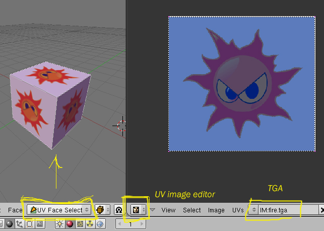 Seleccionamos la opción UV Face Select y abrimos en una ventana nueva el UV Image Editor. Seleccionamos la imagen que incluyo en esta página, llamada Fire, tga.
