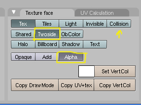 Ahora presionamos F9 y en la ventana Texture face, presionamos los botones para qué queden igual que en la imagen. (fijaros en Collision).