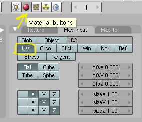 Volvemos a Material (el botón rojo) y en la ventana Map Input, seleccionamos UV.