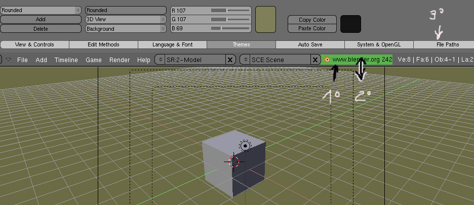 Abrimos Blender y en la parte superior hay una barra con una letra i la cual debemos desplazar con el ratón, (1º colocamos el ratón en la línea y se convierte en 2º una flecha para desplazar la pantalla y luego seleccionamos File Phats) y en la qué saldrá la ventana de información de nuestra configuración. También podemos verla seleccionando la opción i (User Preferencias) en nuestra pantalla.