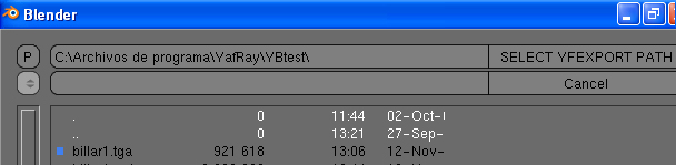 1º Yfexport: Esta carpeta pertenece a YAFRAY, y es donde se guardan los archivos realizados con Yafray con su respectivo archivo XML. La dirección que hay que conseguir es el archivo - Ybtest de la carpeta Yafray. Una vez conseguido, presionar Select Yfexport Path. Cuando hacemos un Render en Yafray, se guarda un archivo llamado YBtest, (*.tga) con la imagen y un archivo Ybtest con extensión XML. Hay que cambiarles el nombre, pues si se vueve a hacer otro render lo borrara.