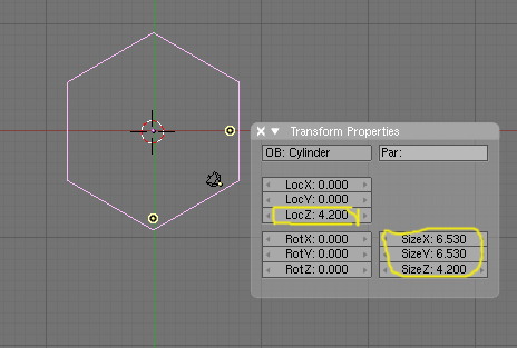 En vista superior (7) Add>Mesh>Cylinder de 6 vértices, y rotarlo 15 grados a la derecha (esto se consigue con tecla R y presionando el botón CTRL y moviendo el ratón gira de 5 en 5 grados). Cambia a Object Mode y prersiona N, saldrá una ventana con las coordenadas y tienes que cambiar los valores por los siguientes: SizeX: 6.530 SizeY; 6.530 SizeZ: 4.200. También tienes que cambiar el LocZ: 4.200 (es importante para centrar el objeto).