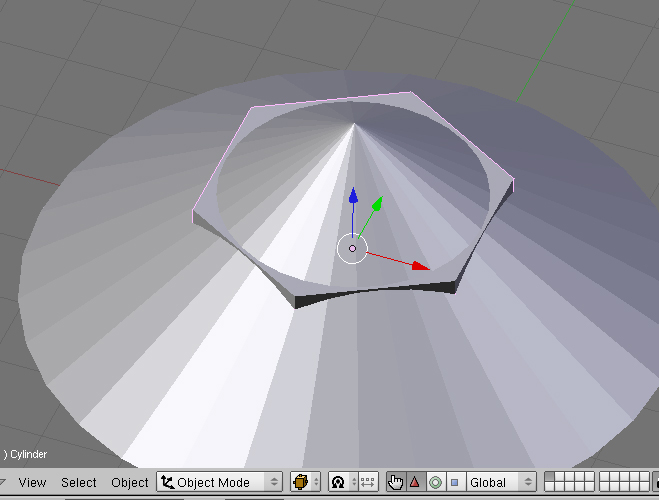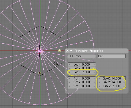 En vista superior crear un cono Add>Cone de 32 vértices cambia a Object Mode y presiona N y cambia los siguientes valores: SizeX: 14.000.