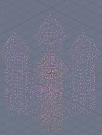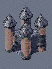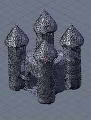 Para cada parte del castillo, añadir un modificador Build con la opción Randomize seleccionada y con el campo Length a un valor de 200. Se puede controlar el inicio y el final de cada parte del edificio. (Si divides el modelo en más partes, con más parámetros, puedes obtener un resultado más a tu gusto) Para simular la explosión de partículas que forma el castillo, crear una Icosphere asignando el valor 2 al parámetro subdivisión. Aplicar el mismo material Halo como el del castillo. Ir al botón Physics y añadir un Efecto Particle. En el panel Particle Motion, incrementar el atributo Normal hasta 200, añadir un parámetro Random igual a 1, y cambiar el Particle Number a 500. Situar el comienzo de la animación a -10, y el final en 80.