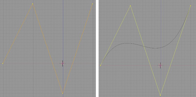 La subdivisión de superficies en Blender se comporta de manera muy parecida a las superficies NURBS. Permite comparar 4 puntos de una curva Catmull-Clark en NURBS. La similitud es que las dos curvas tienen el inicio y el punto final sin tocar los puntos en el medio. La diferencia es, por supuesto, que NURBS es suave y se puede ver linealmente los subsegmentos de la subdivisión de la superficie de la curva.