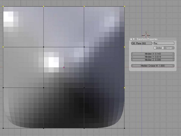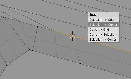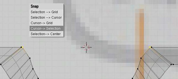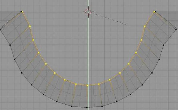 Para reconstruir mejor el borde, podemos hacer uso del cursor 3D en Blender. Selecciona los dos vértices más hacia el interior y selecciona cursor a la selección [SHIFT + S]. A continuación, selecciona todos los vértices de la redonda, activa el cursor 3D como el punto de giro para ampliar, pulsa s para escalar y presiona y para limitar sólo al eje de las Y.