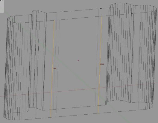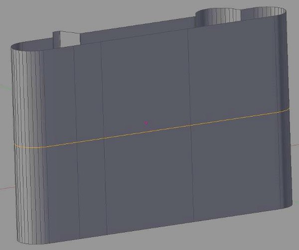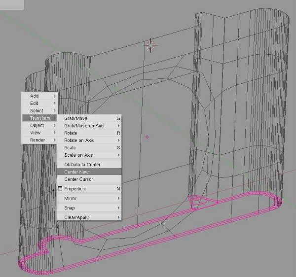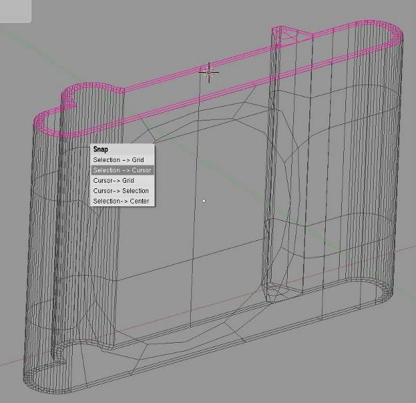 Debido a qué ya hemos construido el perfil, podemos fácilmente copiarlo y pegarlo. Sin embargo, el duplicado se desplazara al otro lado del iPod y es muy difícil hacerlo a mano. Sin embargo, otra vez el cursor 3D de Blender viene a ser muy práctico. En lugar de sólo mover la malla voy a fijar el objeto 3D. Seleccionar completamente el otro borde del iPod y ajustar el cursor 3D a esa posición. El cursor 3D se encuentra ahora en el centro de la malla de la selección. Esto es muy importante a tener en cuenta. En el siguiente paso duplicamos la tapa y reseteamos el punto central de la malla con el Nuevo Centro. Esto mueve el punto central del objeto 3D al centro de la malla 3D interior.