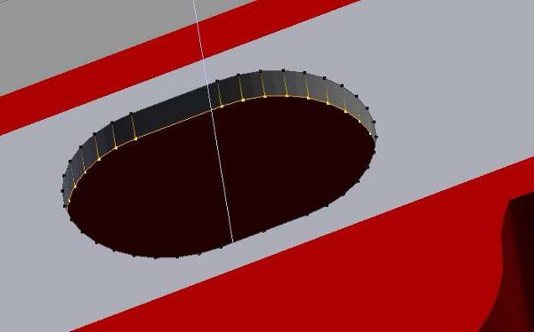 Después de quitar los bordes, donde el botón deberá ser insertado, utilizamos en Blender el ajuste 3D selección del cursor (Mayúsculas s) a la posición del cursor 3D en la posición adecuada. Hemos escalado el agujero a un tamaño correcto y, luego, he empezado a llenarlo de caras rectangulares en el medio.