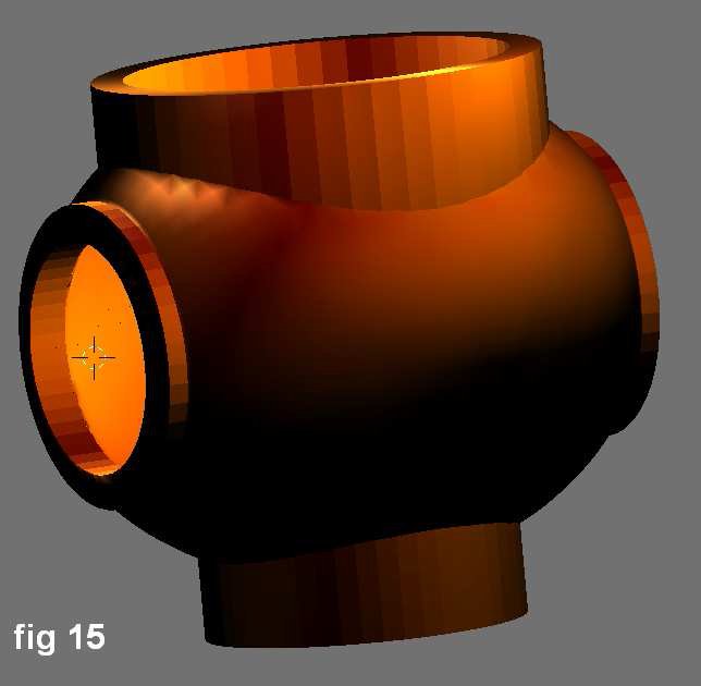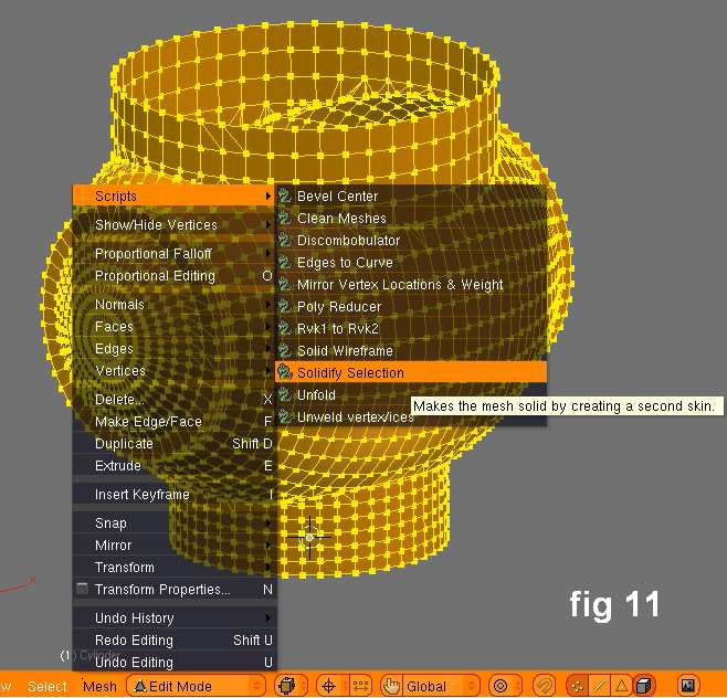 Como resultado deberías tener una malla única con un par de vértices redundantes como error. Esta malla fue abierta al borrar el vértice superior central con el fin de agregar una delgada pared dentro de la malla con el uso de los nuevos scripts de Blender 2.44. Selecciona todos los vértices, luego ve a mesh>>scripts>>solidify selection.