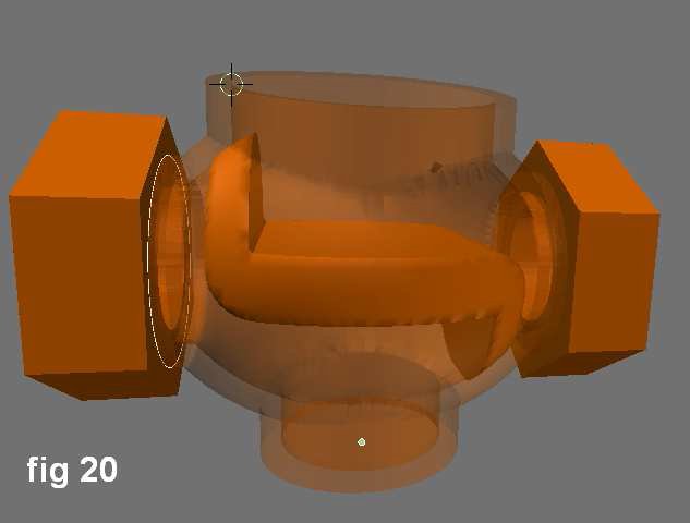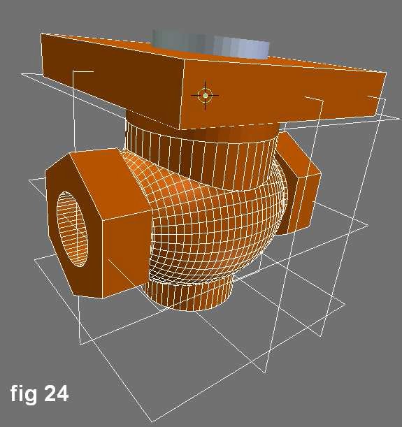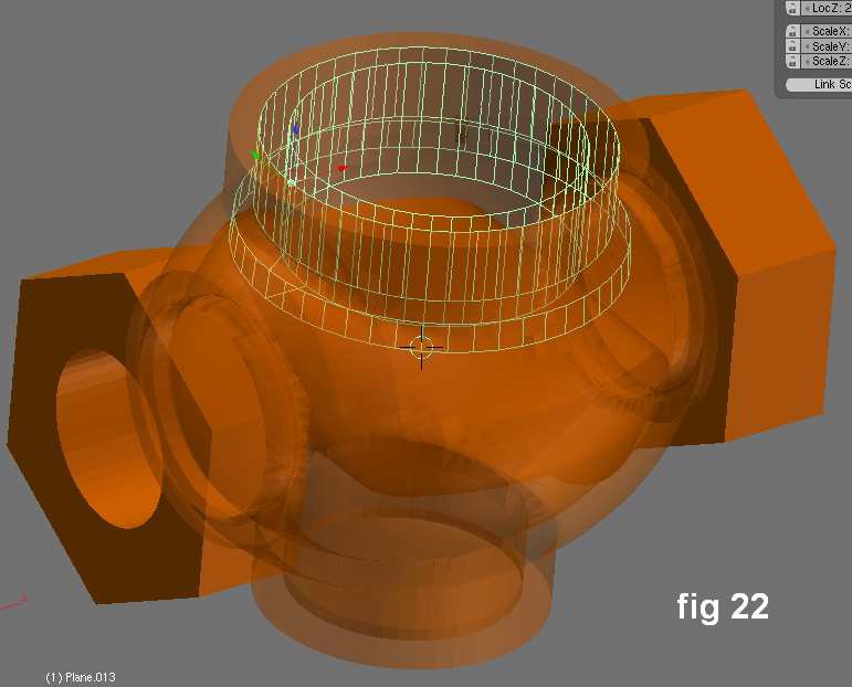 El cuerpo del solenoide se hizo con una UVSphere a resolución media en vista superior, con 48 segmentos, 48 anillos (rings) y un radio de 30. Sin abandonar el modo edición, y con todos los vértices aún seleccionados, en vista frontal, la esfera fue rotada en 90 grados. No obstante, en modo objeto los ajustes pueden cambiarse gracias al cuadro de diálogo Transform Propereties [Tecla n]. Los ajustes de la nueva esfera deben ser configurados en Y,Z=48.00 y X=60.00 para obtener una forma elipsoide. Dentro de ella habrán 2 cámaras. Se crearan muchas uniones para modelar las conexiones de la valvula.