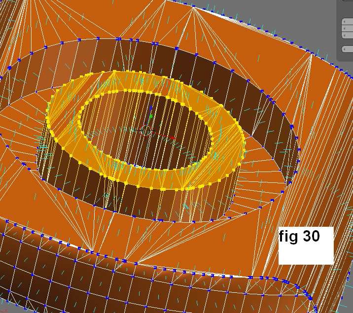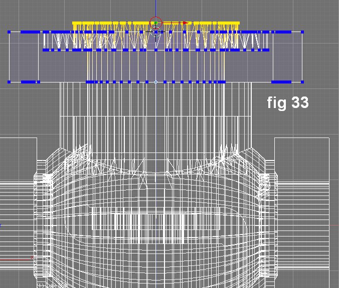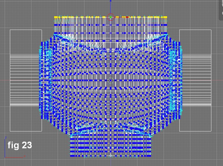 De nuevo, los vértices fueron puestos arriba para corregir dichas cavidades. Un patrón de referencia geométrica para los hoyos de los tornillos se hizo usando la función Rotation/Scaling Pivot fijar PIVOT to 3D cursor.