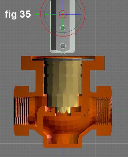Finalmente, otro cilindro fue agregado a la valvula solenoide, primero, duplicando planexy y ubicandolo en Z = -28.50, X e Y = 0. En la posición del plano duplicado, se agregó un cilindro de 48 vértices, X e Y=30.00, Z= 12.633 hacia el interior del solenoide.