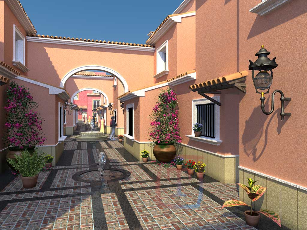 Es otra imagen revisitada. LightWave con radiosidad, nada especial. Se trata de vender una urbanización que tiene calles estilo pueblo, junto a la costa mediterránea.