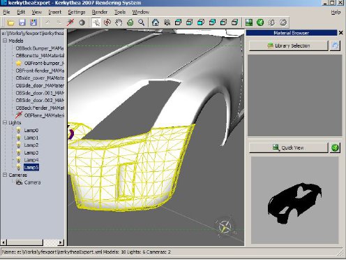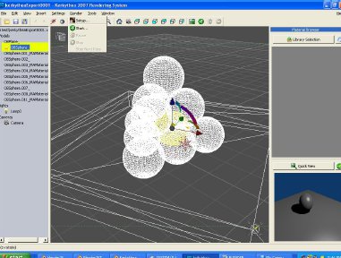 Parte 3: Importando. Aquí viene la parte divertida. Arranca Kerkythea 2007. (Al momento de escribir esto, ésta es la última versión). Seré muy breve sobre lo que está viendo ahora. Kerkythea esta dividido en cuatro paneles. En el lado izquierdo es el árbol de todos los objetos de la escena. En el medio esta la vista 3D. A la derecha hay una librería de selección de material y por debajo de un panel de previsualización rápida con un pequeño botón verde de render.