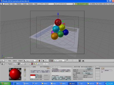 Parte 1: Modelado y creación de la escena. He elegido una escena muy simple que he recreado del tutorial del motor Sunflow (otro renderizador muy bueno) que apareció hace unos meses en la revista Blender. Primero, abra la versión de Blender a Kerkythea. Cre una escena simple cómo se muestra en la figura (Fig. 1). Asigne un color difuso de base a todas las esferas. Coloco una luz en la escena y seleccione el botón de lámpara. En el panel de Shadows and Photons (sombras y fotones) de Kerkythea, haga clic en el botón activar y sombra. También seleccione el color negro, como color del Mundo. Más adelante explicaré el porqué de elegir el mundo negro.
