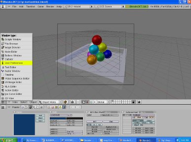 Parte 2: Exportando. Ahora presione [F10] y vaya panel de Render. Aquí podrá ver un menú desplegable justo debajo de la gran botón de Render. Haga clic en él y seleccione Kerkythea (Fig. 2). Después de hacer clic en él podrá ver dos pestañas más en el panel de Render. Seleccione Kerkythea nuevamente. Mueva el Mouse hacia la ventana de 3D y haga clic en el tipo de pantalla (Fig. 3). Seleccione las preferencias del usuario. Haga clic en el botón de la ruta del archivo.