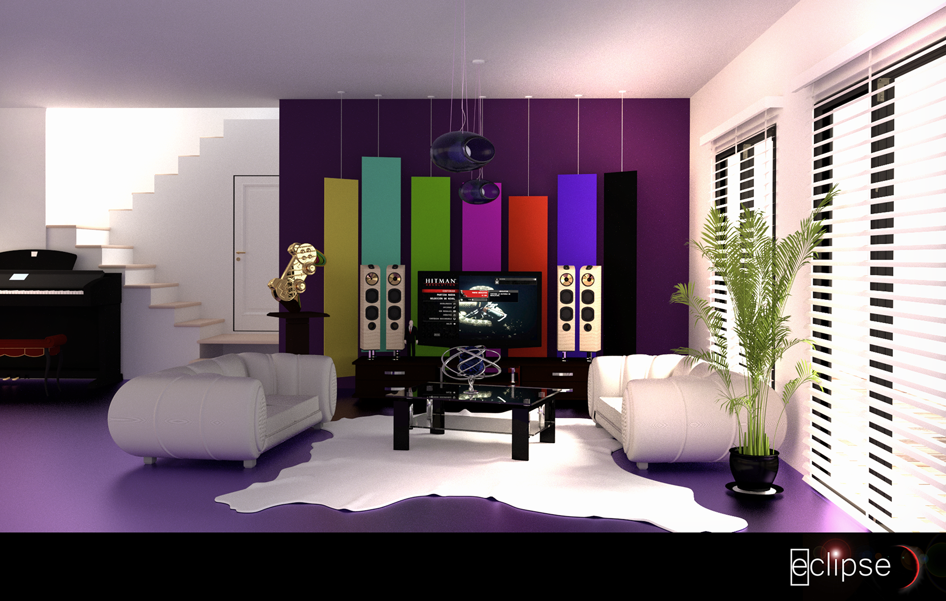 A mí personalmente me gusta. Quizá un poco saturado el color y algo de fuga de color también, pero en general me gusta. Lo que veo raro es que el escalón que está a la altura de la puerta no tenga algún soporte debajo, eso estructuralmente no se sostiene, y menos con el grosor del tablero que usas. También me choca ese surco negro alrededor de la puerta, si es hueco lo veo demasiada separación, la puerta debería quedar más sellada. Además, no tiene marco ni dintel, da la sensación de estar abierto el hueco en la pared y sin más se ha colocado la puerta. Los paneles decorativos de colores se ven muy bonitos, pero quizá demasiado planos o estrechos, parecen hojas y la planta qué esta delante de la ventana es muy extraño que dándole la luz del sol directamente no arroje sombra sobre la estancia. También me choca qué el sofá que está junto a las ventanas arroje sombra hacia atrás, o sea, en dirección hacia la pared, cuando del lado contrario no se ve ninguna luz intensa en esa dirección, supongo que, será alguna luz de relleno la qué te está haciendo que ocurra esto. Saludos.