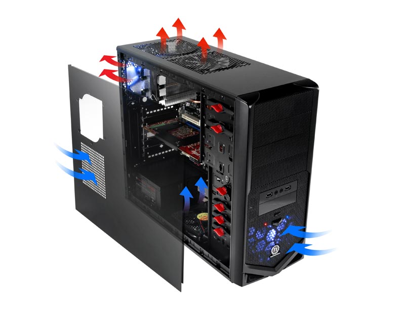 En tu caso el frontal ya lo tienes y el trasero también, ahí ya tendrías que decidir si quieres meter aire desde el lateral poniendo al menos un ventilador de 120 o bien si quieres aprovechar la toma de aire desde el suelo donde el aire está más frío para empujar el aire hacia arriba y si quieres ayudar al aire caliente a salir poniendo al menos un ventilador de 120 arriba. Mientras pongas los ventiladores metiendo y sacando aire como en el esquema no tendrás problemas.
