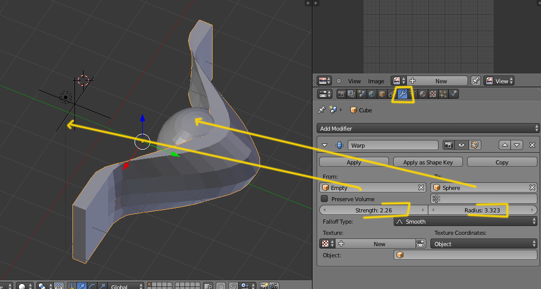 Y luego está el WARP modificador donde se puede jugar con emptys y objetos y la forma curva qué se le quiere aplicar al objeto.