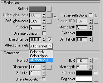 Confundí affect all channels en el reflect, con refract, claro está el multimattelement, soporta transparencia de los materiales Vray con refract, pero no reflect. De hecho, me imagino que podría ser una locura enmascarar con ID el reflejo de los objetos de una escena. Por cierto, el tutorial anterior, es para versiones anteriores a la 2.0, después de esa, Vray ya soporta reflect con alfa (de hecho, tu ya lo tienes así). Pero podrás leer que existe una herramienta nueva, 2.30.01 para hacer matte for reflection and refraction en el link anterior. Yo debería tenerla, pues uso la 2.40.04. Así que investigare otro poco, pues también me va a hacer mucha falta.