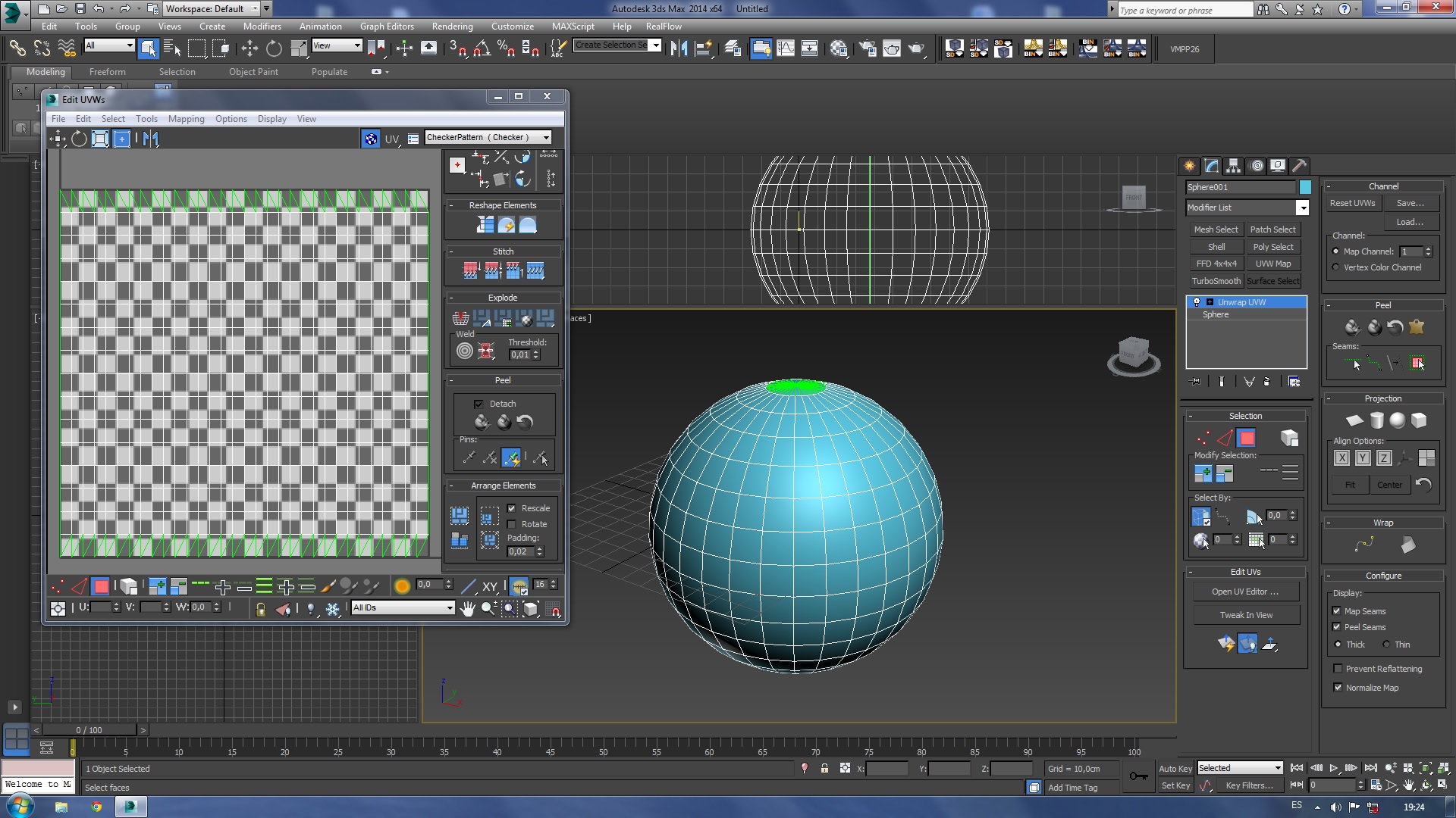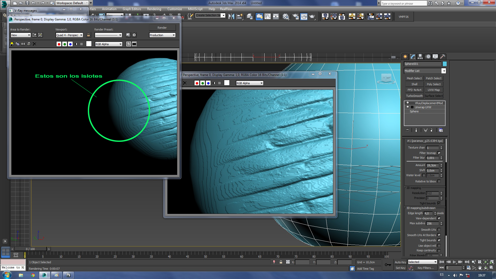 Luego importante, si tu esfera finalmente en 3dsmax, va a ser, por ejemplo, esa, nivel 0 con turbosmoh a 2, tendrás que usar en Mudbox, como objeto base, la esfera en ese nivel de subdiv, y usar la esfera en el nivel más alto de subdivisión como objeto highpoly, esto lo ves en las opciones para extraer el mapa de desplazamiento.
