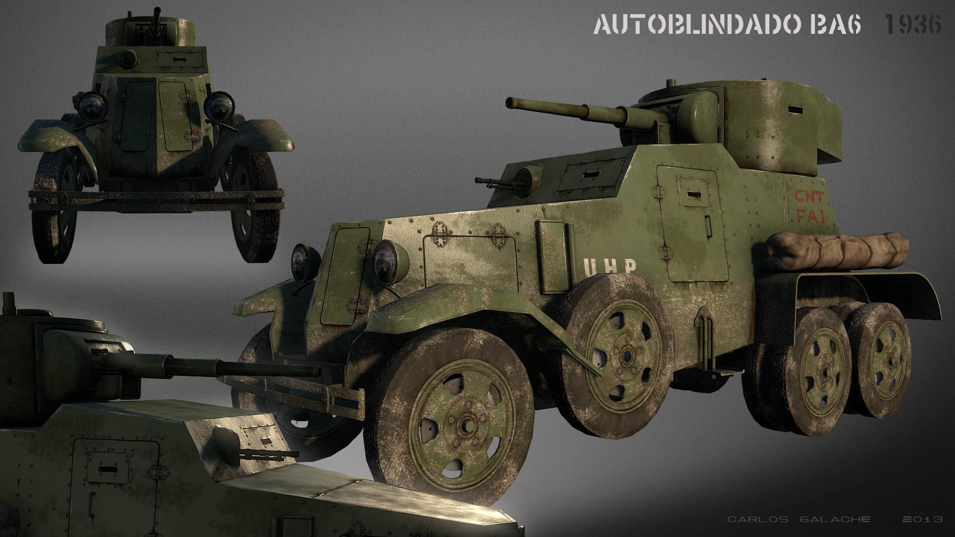 Como estoy sin trabajo, unos días después de terminar mi primer modelo (http://www.foro3d.com/f27/mi-primer-...tml#post896977) me puse manos a la obra con algo un poco más complejo y la verdad es que estoy contento con el resultado. El sistema usado para él modelado es el mismo que en el anterior, no hice un modelo completo en HIGHT, si no que primero modelé el LOW al que añadí solo varios detalles para sacar los normalmaps como las puertas, bisagras, ruedas, tornillos, remaches, etc. Y luego todo a Xnormal, Adobe Photoshop para las texturas y Marmoset. Como en mí primer modelo y según me comentó en el otro hilo makaka podría haber optimizado mejor la malla, sobre todo en las ruedas y en alguna otra zona podría haber metido menos polys, pero bueno, estoy aprendiendo. La textura es de 4096, para motor de juego habría que bajarla a 2048, pierde un poco, pero no se ve mal del todo en UDK.