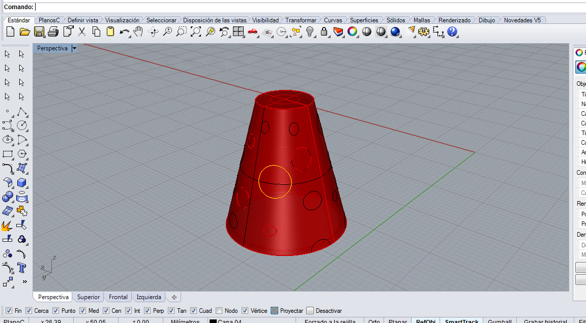 Hasta el momento si he conseguido proyectar dicha textura en la superficie elegida, pero no la he conseguido troquelar. Lo estoy intentando a través del tutorial de Rhinoceros nivel 2, ejercicio 9, pero en el momento en que intento extraer la superficie o extrusionarla, el intento es fallido.