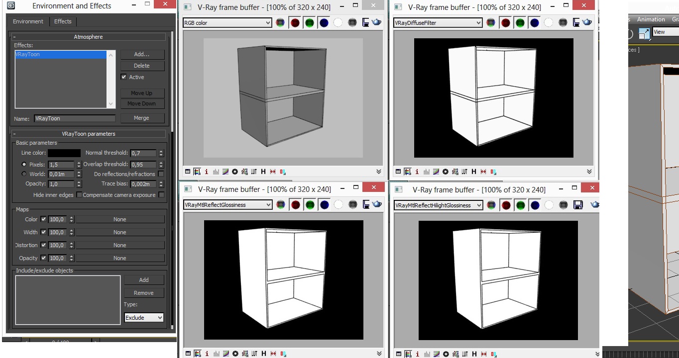 Os planteo mi duda. Estoy trabajando con 3ds Max + Vray. La escena se compone de un armario, una Vrayphisicalcamera y no existe iluminación. Quería renderizar el objeto con una textura de superficies totalmente blanca y las aristas vistas en negro.