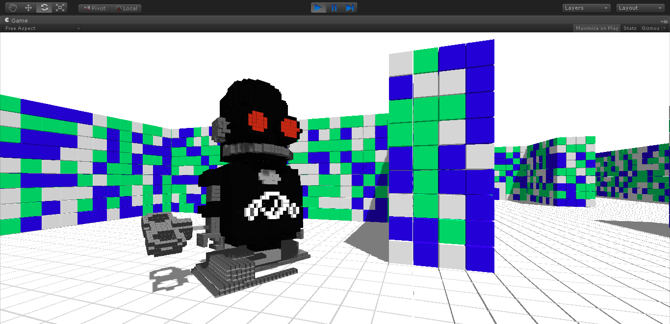 Cuantas ideas que estaría genial poder hacer, gracias por los comentarios Marc31. Está todo modelado y texturizado en 3dsmax con editpoly y después voxelizado en 3dsmax con rayfire voxels. Me imagino que hoy podrías hacer ese marciano con cubitos puestos a mano en qubicle (parece ser el standar) o magicavoxels (opensource). La explosión de voxeles se podría hacer en 3dsmax y bakearla a Unity, aunque sería más fácil usar herramientas para Unity tipo minecraft que aplican las físicas a los voxeles, yo tampoco las he utilizado. Con el fluido voxelizado, que me tira mucho, se me ocurre lo mismo, hacerlo en 3dsmax, voxelizarlo en max y bakearlo a Unity, pero lo bueno de verdad sería hacerlo con algún engine cubico para Unity de los que traen dinámica de fluidos (creo que Terrain engine tiene). Tienes razón, la animación de los pies no es realista porque se deslizan en vez de rotar.