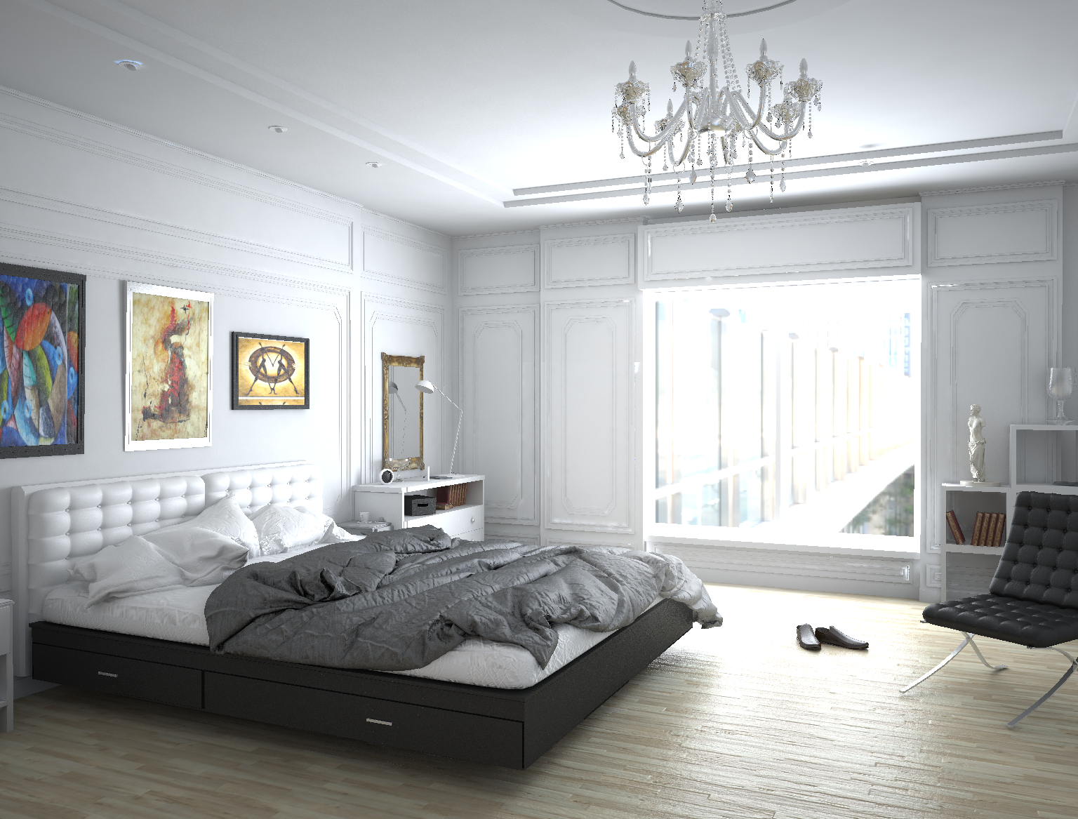 Buenas, muy bonito el interior y muy bien modelado. En mi opinión el suelo tiene un poco de bump de más, un aspecto de barnizado queda mejor. La luz que entra por la ventana es excesiva, ilumina demasiado y queda saturado, los niveles de blanco de la luz o de las paredes habría que haberlos bajado un poco. Por lo demás está muy bien, la lámpara, la cama y demás se ven muy bien. Saludos.