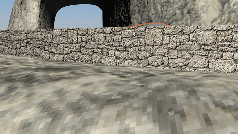 He buscado soluciones y di con que podía ser que tenía qué poner el Filter en Of, pero ni así. Ya no sé qué puede ser. Si al modelo le aplico una textura seamless, se ve bastante mejor, pero quiero hacer un plano general donde se ve parte de la montaña y se nota las repeticiones. Tengo un muro que bordea toda la curva, y esa textura se ve bien, es una textura seamless de unas piedras que he encontrado, pero en cambio sí le aplico una textura pintada en Adobe Photoshop, me pasa lo mismo que con la montaña. A ambas texturas en el hardware texture le puse el texture resolution en highest, porque leí que así se podría solucionar, pero tampoco.