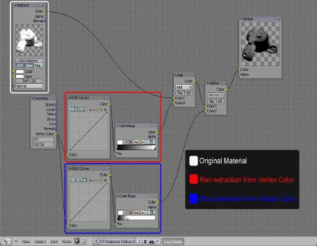 Retocar materiales es una manera de controlar áreas oscuras usando nodos de materiales con vértices de color. Es muy útil si no consigues los resultados deseados en una área ensombrecida de algún modelo. Ahora puedes rehacer el modelo, pero rehacerlo toma tiempo. Otra manera seria usar mensaje procesadores como tipificado por el uso de un nodo compositivo para dar un efecto 2D, aunque esto crea un parcialmente incorrecto look en 3D. O puedes ajustar el sombreado del modelo con retoque material en menos tiempo.
