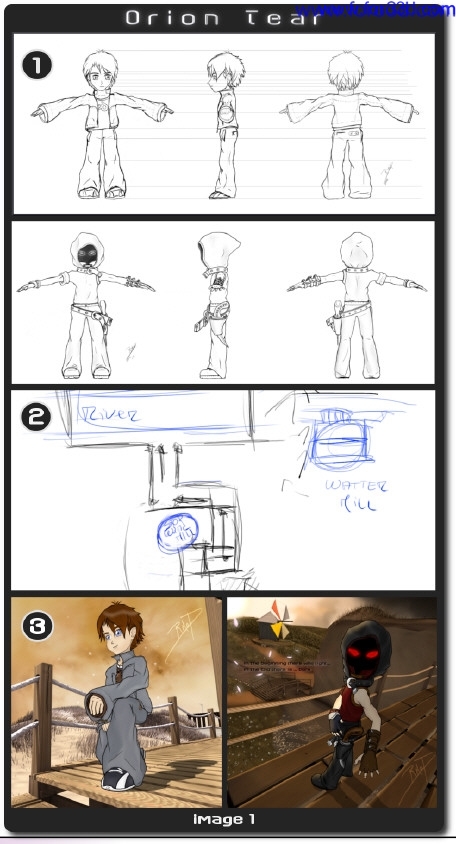 Todo necesitaba ser creado desde la nada. Para Orion (img. 1-1) tenía una idea básica. Quería qué tuviera las mismas proporciones de cuerpo que Zidane de Final Fantasy 9, y el look de mi diseñador de personajes favorito (Tetsuya nomura), personajes unidos con mi propio estilo de dibujo.