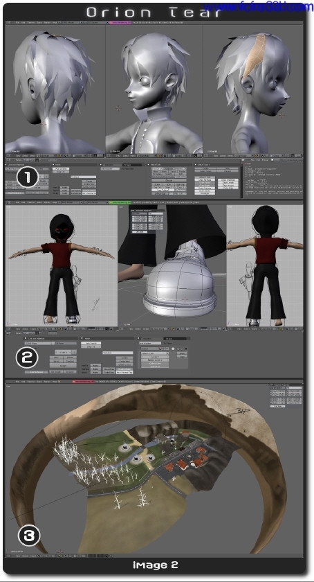 Empecé con la cabeza de Orion, ojos y cabello; después el cuerpo y finalmente su ropa. Por cierto, el modelo de Orion que aparece en el número 4 debió ser remodelado en un 80% debido a problemas de rigging, más de eso en el capítulo de rigging. Para todo el cuerpo y zapatos, use el punto a punto técnico, me refiero a qué posicióne todos los puntos en el espacio, basado en el dibujo de las manos, y solo entonces los uní haciendo las caras. Las ropas fueron hechas en un principio por un montón de círculos, los cuales uní formando tubos (tristemente perdí las imágenes de eso y resulta algo difícil de explicar). Por ejemplo, básicamente una camiseta esta subdividida de manera que, empieza en una mano y termina en la otra. Entonces convirtiendo los tubos en mallas pude cortar las caras que no importaban. Por ejemplo, las que estaban en lugares como el cuello y el cuerpo. Después de un poco de ajustes y cortar loops, lo que obtienes es una muy buena malla de topología para la camiseta qué se deforma muy bien.