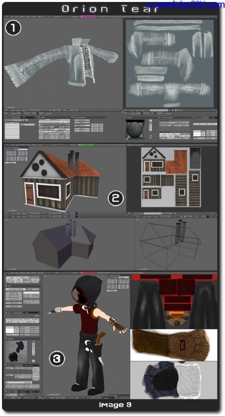 Ejemplos: para la chaqueta de Orion (3-1) tome fotografías de una chaqueta real, entonces en Gimp, basándome en la chaqueta real y en la etiqueta UV Unwrap, pinte todas las puntadas y cosas de mezcla reconocibles, como también todas las partes lavadas. Aunque se vio genial, se veía principalmente como era, pintada. Para qué se viera más real, tome una muestra de mezcla de fotografías reales y las duplique un montón de veces hasta qué toda la etiqueta estuviera cubierta, asegurandome a la vez, que se viera similar.