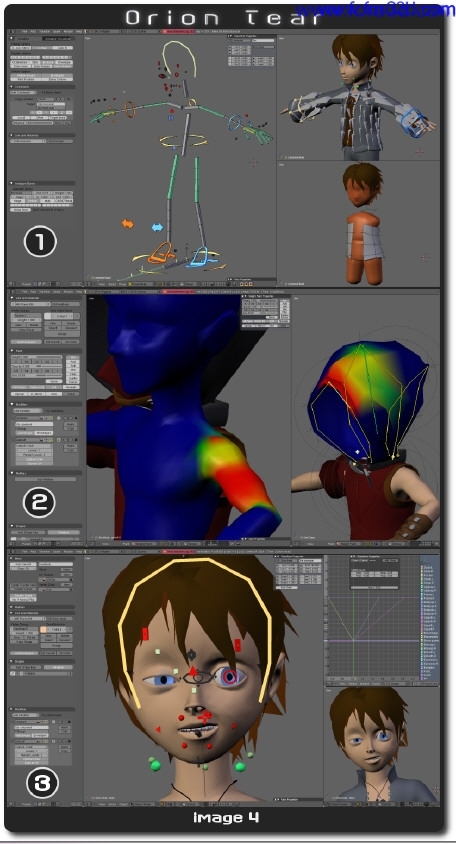 Haremos la armadura de huesos (4-1); es necesario definir que vértice esta influenciado para cada hueso, hacemos eso asignando los grupos de vértices y usando pintura pesada para afinamiento (4-2); Teclas de formas correctivas son agregadas encima de todo para asegurar deformaciones principales propias, en lugares como uniones y pelvis.