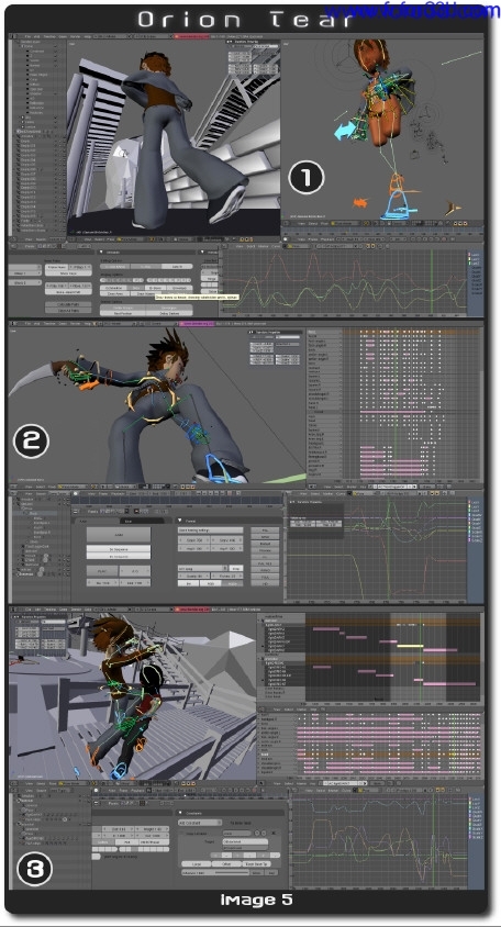 Así que pase las siguientes dos semanas haciendo ingeniería de inversa y creando el primer Orion con rigging. Bien, después de dos semanas tuve el Orion listo, pero aún o sabia cómo hacer un rigging, así que, todo parecía un poco tonto. Era ideal para ciclos de marioneta y movimientos básicos, pero yo quería qué fuera capaz de competir con Jackie Chan. Así que empecé a crear otro riggin, esta vez para Dark, expandiendo mi investigación a los rigging de Emo y Prog de ED. Después de otra semana desensamblando huesos, de repente empecé a ver toda la lógica de las cosas y progresivamente todo adquiríó sentido. Otras tres semanas más pasaron hasta qué completé el rigging de Dark. Después de eso regrese a Orion, y debido a qué la primera topología de la malla era muy mala, por deformaciones, tuve que remodelar todo y rehacer el rigging. Después de otro mes los tuve listos para la acción. Describiré ahora el procedimiento de rigging usado para Lagrimas de Orion.