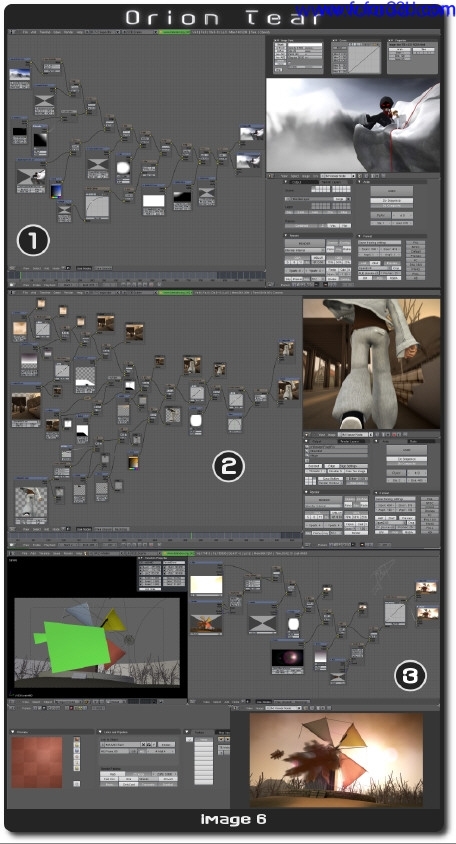 Renderizando, composición: para mí, componer es convertir renders deficientes en sorprendentes imágenes finales con cualquier truco que puedas tener. En verdad no tengo ningún técnica pre-establecida, este tipo de cosas las hago por instinto. Algunas personas podrían llamarlo suerte, pero eso querría decir que tuve suerte 70 veces (el número de escenas).
