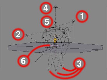 5- Esta luz (puesta) fue usada para producir el punto naranja en el suelo. Por supuesto, el suelo ya estaba completamente iluminado por la luz hemi, así que, una fuente normal de luz naranja no habría trabajado. La única manera de producir el punto naranja era eliminar el color complementario (azul). Así que está fuente de luz era negativa con un color azul que sustraer, y dejar el naranja.