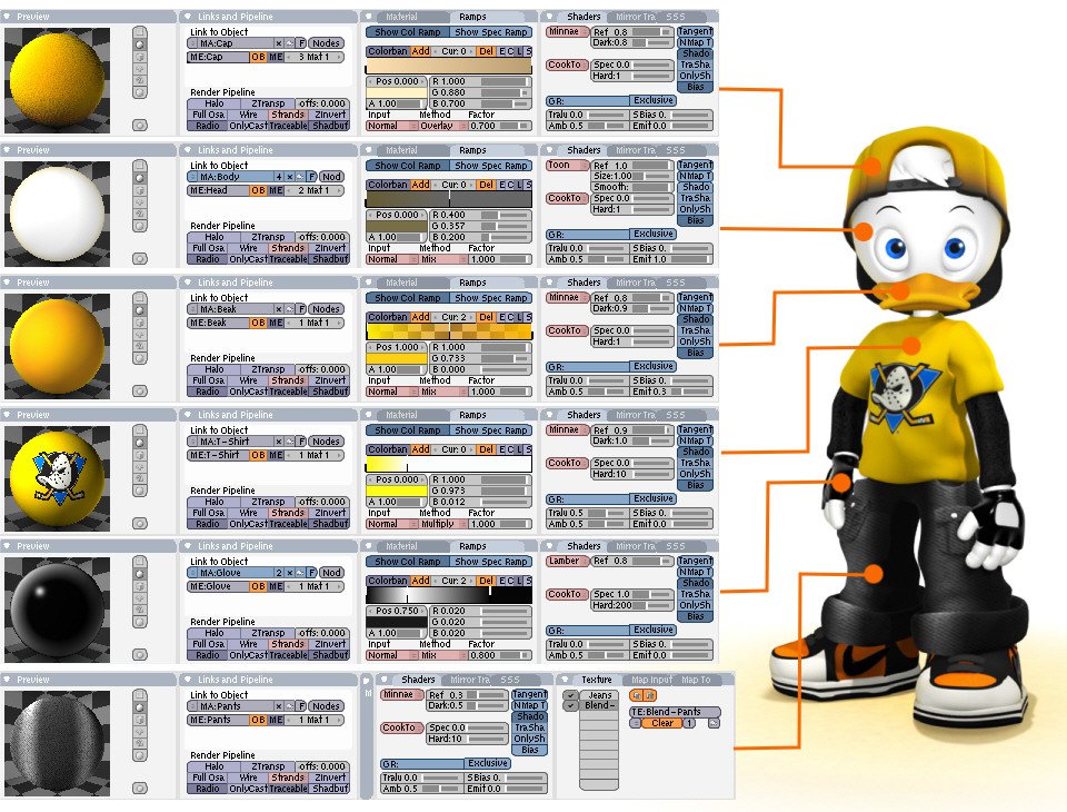 Lo que la gente no parece sospechar es que pueden obtener personajes con look animado muy agradables dé la manera opuesta, una fina transición entre áreas de luz y sombra. También te ayuda si le das al sombreador un tamaño de valor medio a alto para hacer las áreas sombreadas tan pequeñas como sea posible, especialmente si tu personaje esta frente a un fondo iluminado. Los otros sombreadores que usé fueron, principalmente, Lambert para los guantes y Minnaert para las ropas y el pico. Es solo un asunto de jugar con las opciones para ver cual es la mejor combinación. Casi la mayoría de los materiales que usé tenían una rampa de sombreado, lo cual le da un buen toque, de coloreado como un durazno en caída libre.