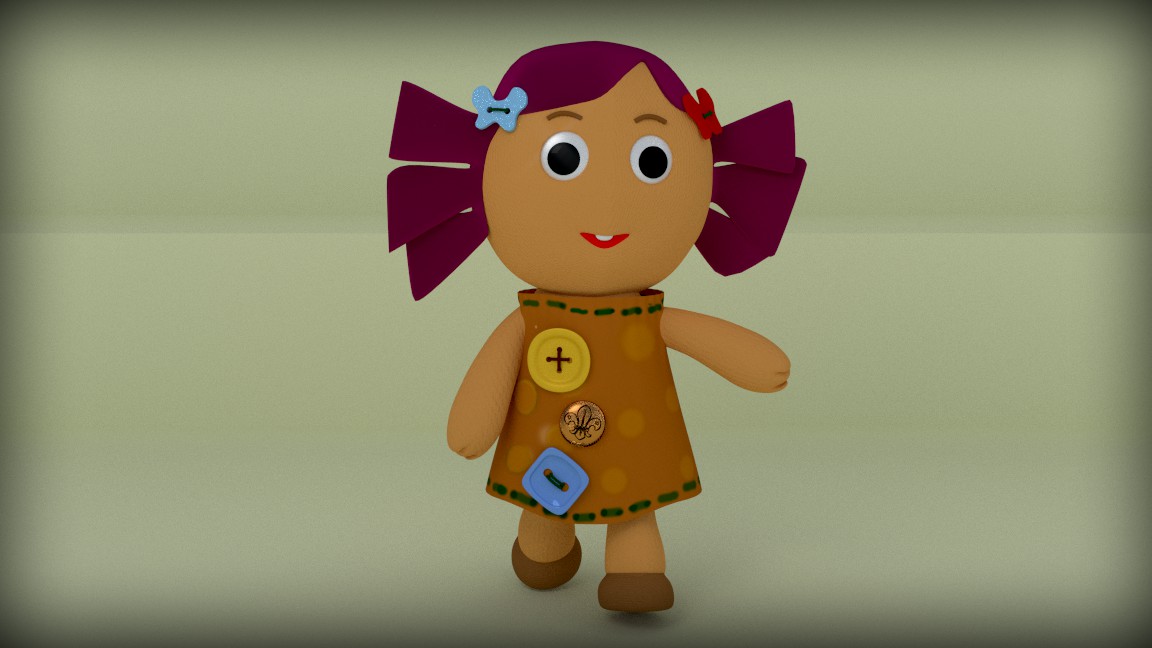 Vaya qué graciosa. Este personaje, aparentemente sencillo de hacer, tiene su complicación, porque tiene que parecer una muñeca de trapo. El modelado lo has hecho muy bien (me gustan las manos, los botones y el pelo) También la pose.