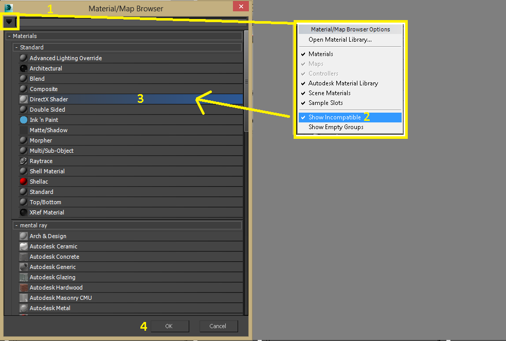 B) Elegir un Slot vacío y asignarle el material DirectX Shader, si no aparece en Standard, deben marcar Show Incompatible.