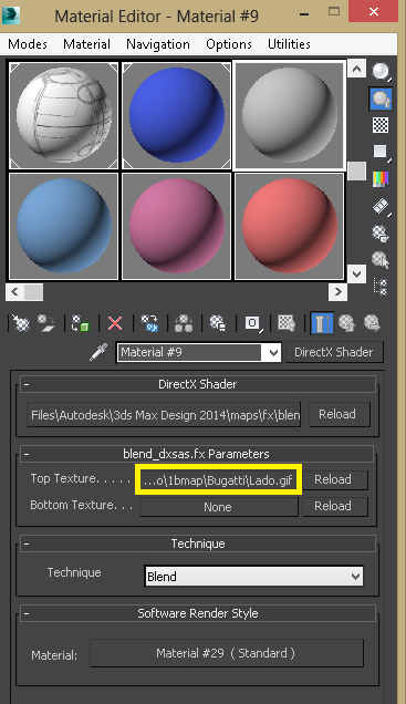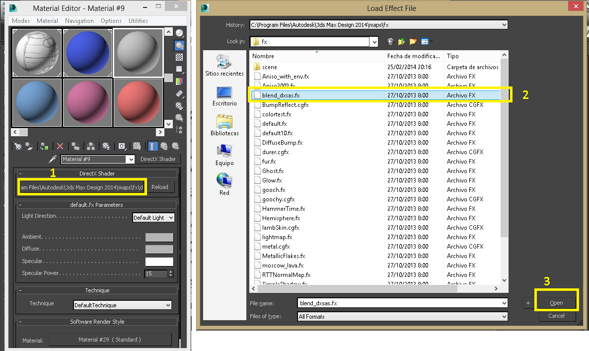3.- Cambiaremos el Shader Default, fx por blend_dxsas, fx. Este Blend nos servirá para ver nuestro modelo a través del plano, (obviamente que el plano debe tener marcado BackFace Cull).