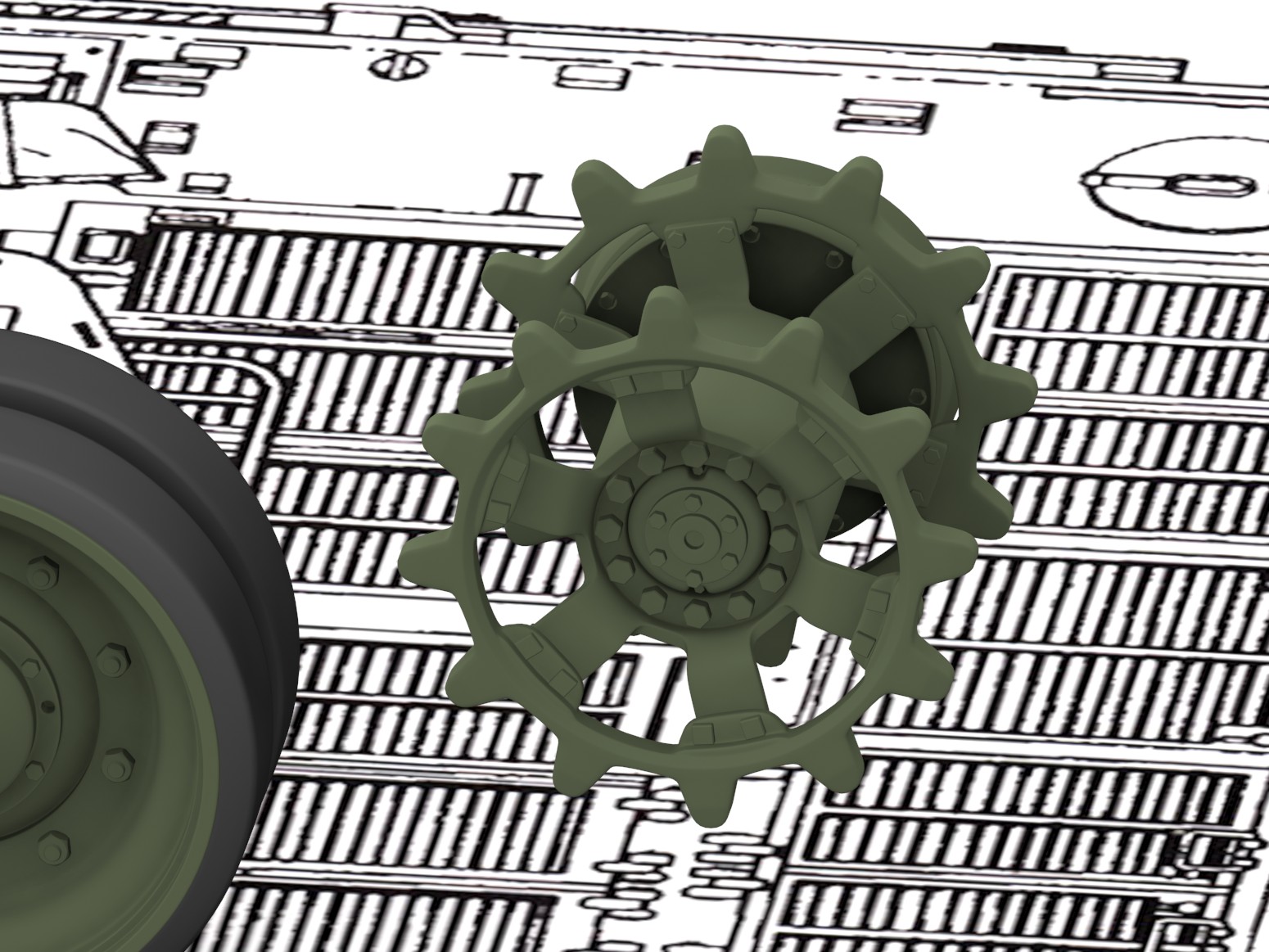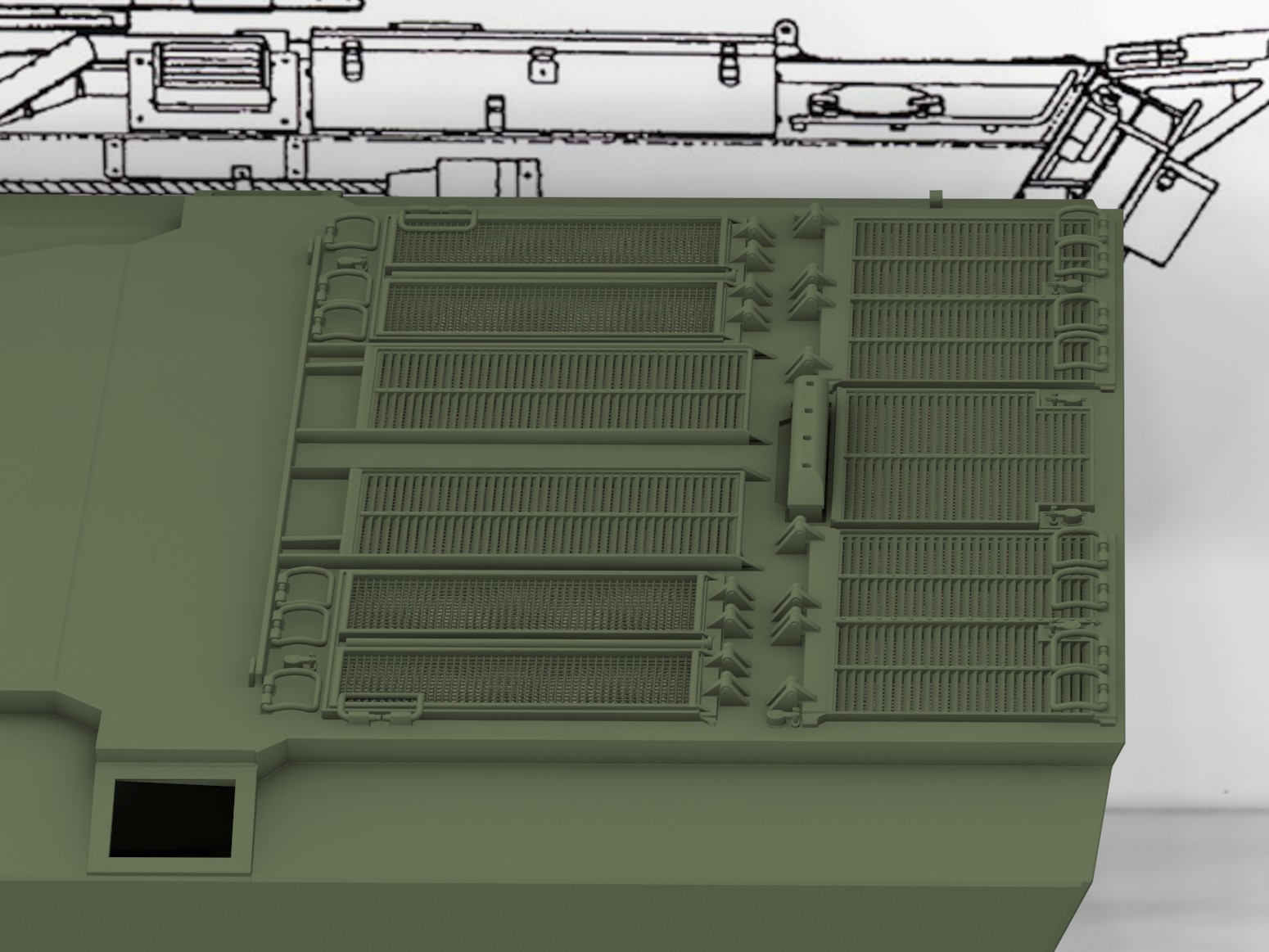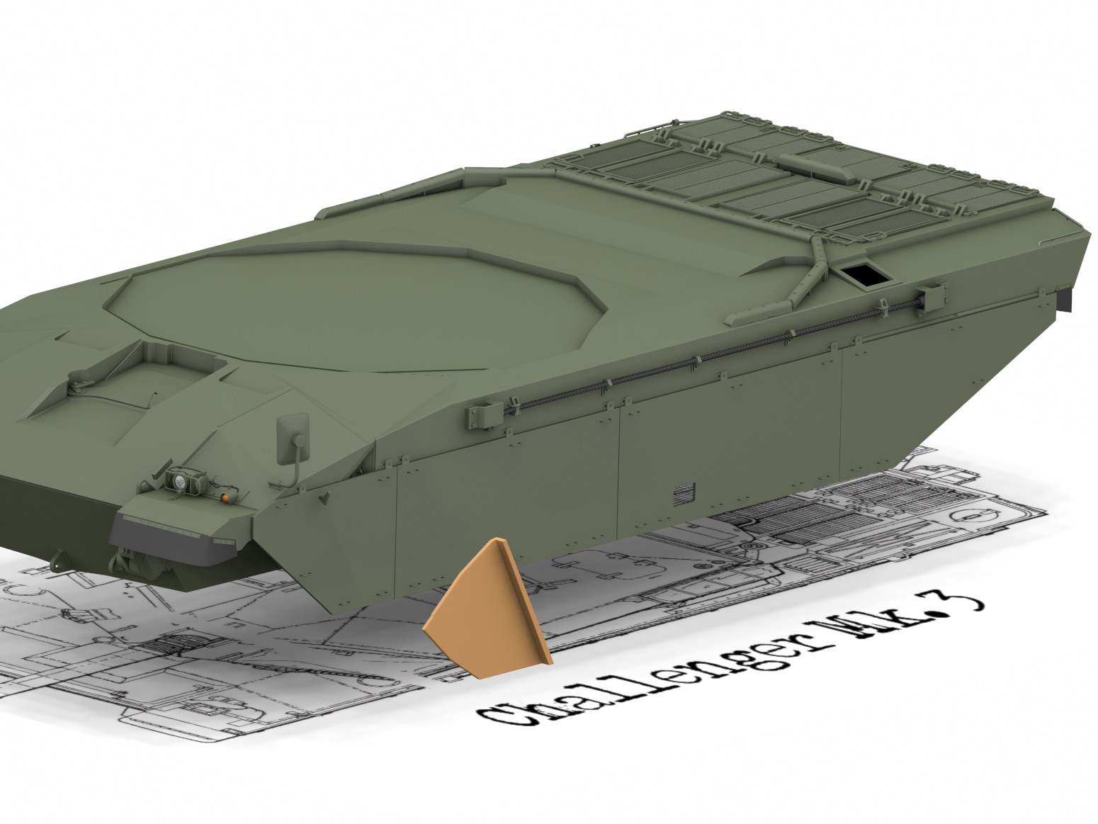 Os enseño los wips empezando por el rodaje y las orugas y acabando con los Faldones que es donde me quedé, pues no sabía que tipo hacerle, si el original (muy simple) o el de la primera guerra del golfo o el de después. Así que haré los dos, total sólo es cambiar los Faldones por unos más gordos y con caucho colgando. La barcaza cuando la veáis se las trae. Nunca había entendido yo como podían meter una torreta con un anillo circular en un dodecagono. Una nota, es de los pocos tanques en el que el conductor va en medio de la barcaza, ingleses.