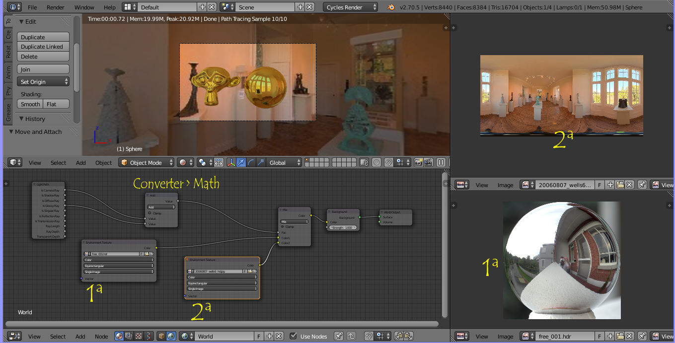 Buenas, hace poco quise implementar en mis proyectos imágenes HDRI en Blender (Cycles) para darle un mayor realismo a la composición y a los reflejos que hubiese en la escena, el problema es que no consigo obtener el dichoso resultado.