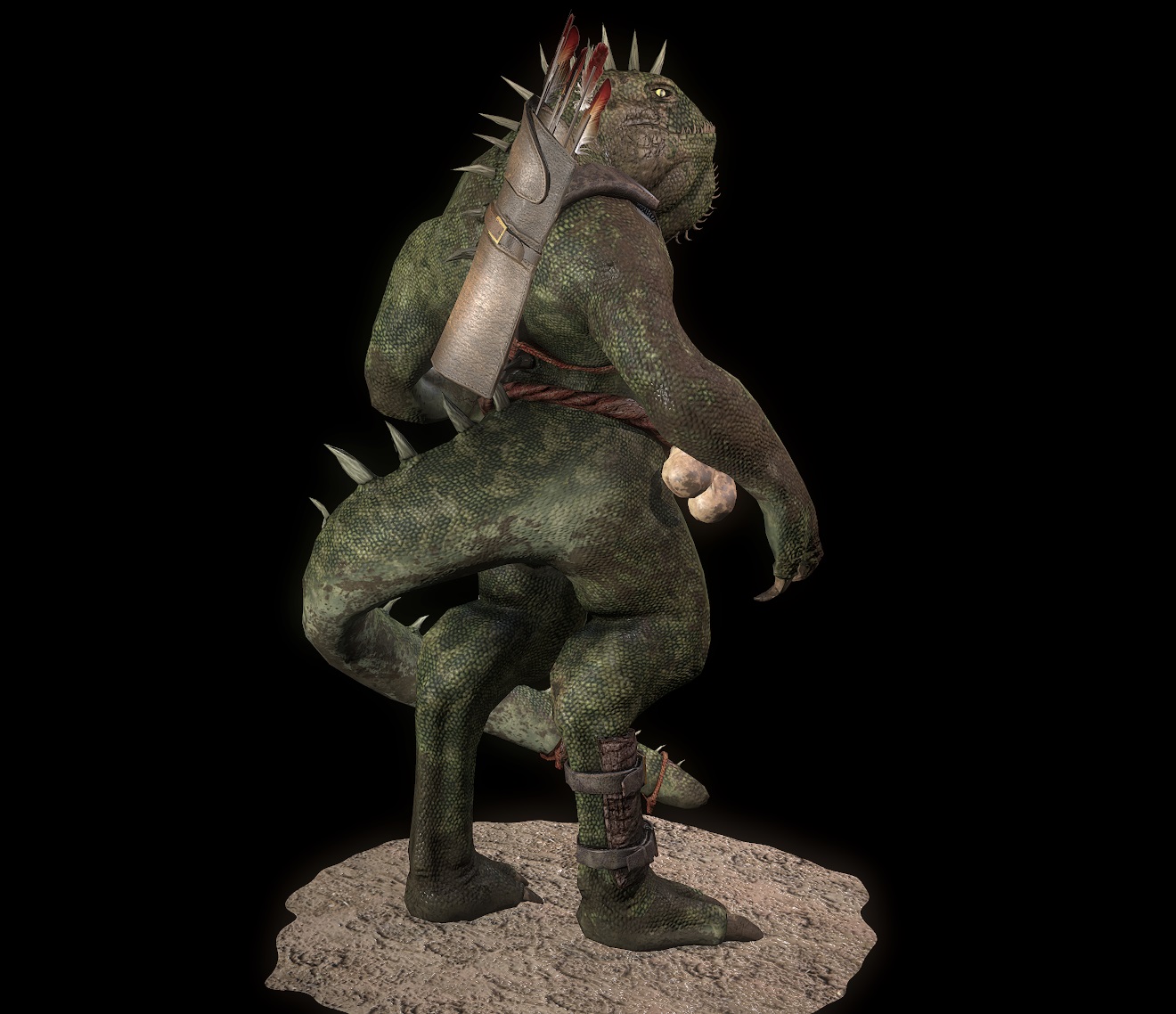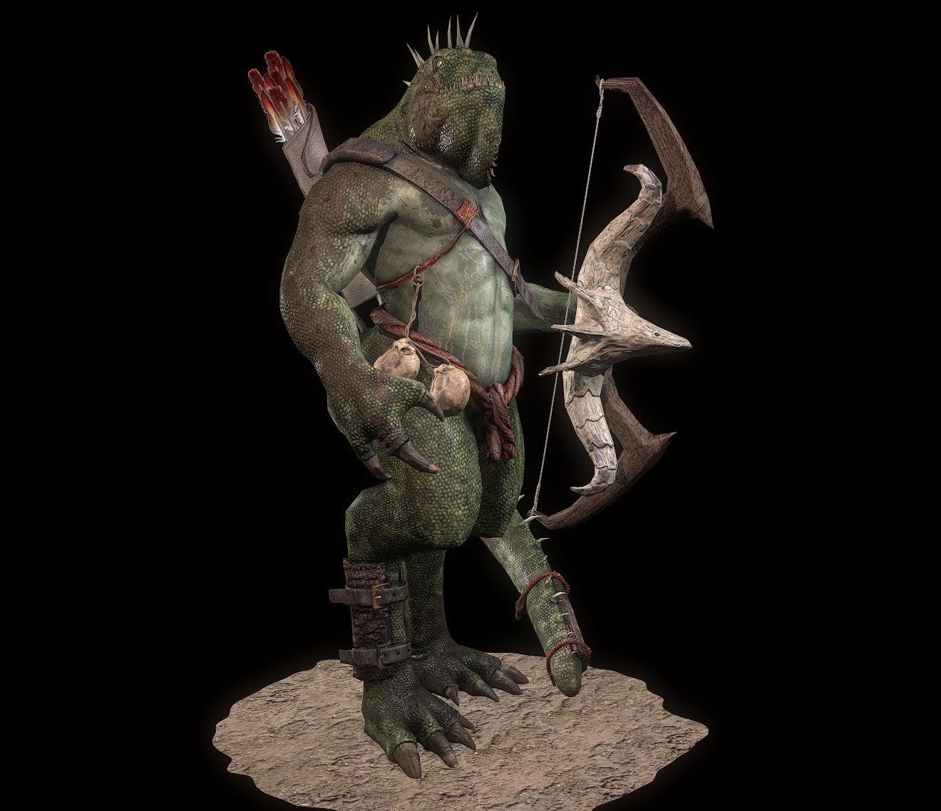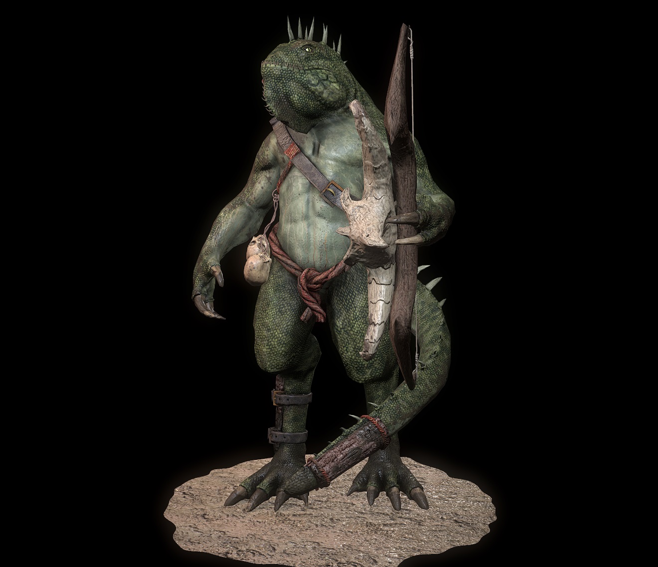 Un poco se ve raro cómo se las ingenia el lagarto para agarrar el arco, o las zarpas son demasiado cortas y gruesas, o el arco es muy ancho, o el cráneo que lo adorna muy grande y separado, pero a esa zona le falta un poco más de pruebas de tamaño y proporción.
