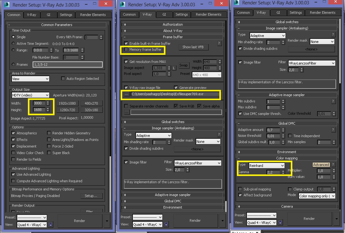 Bueno, dejo aquí mis settings que creo me dieron buenos resultados en esta escena en proceso de 3000x1688 (HDtv, es decir, 16:9=1,777).