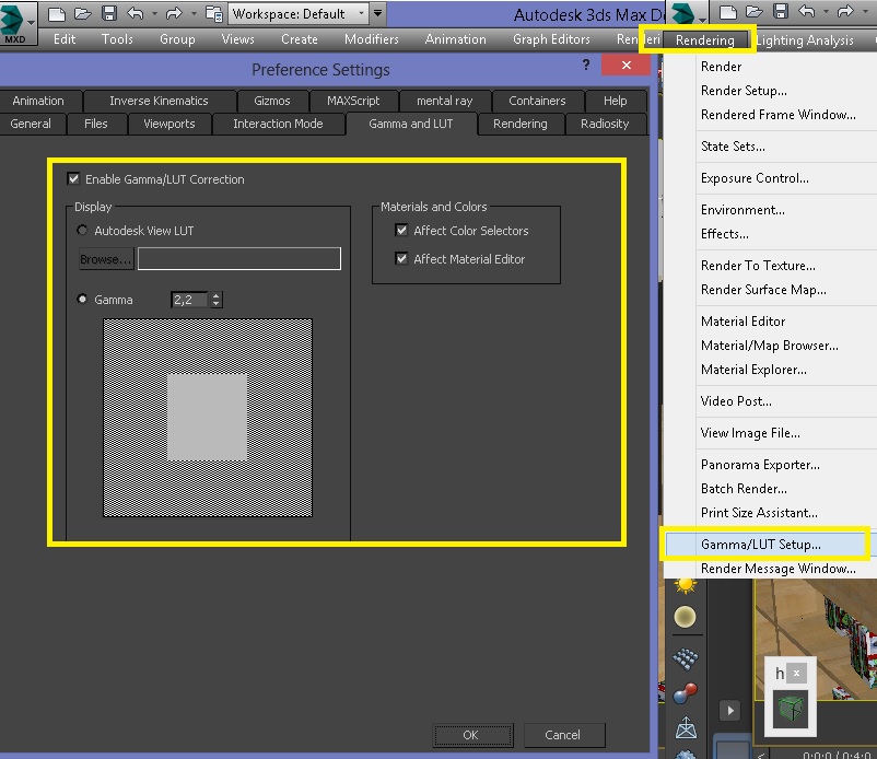 Lo otro es trabajar con gamma a 2.2. En max 2014 se debe hacer lo siguiente para la salida de archivo a 1.0.