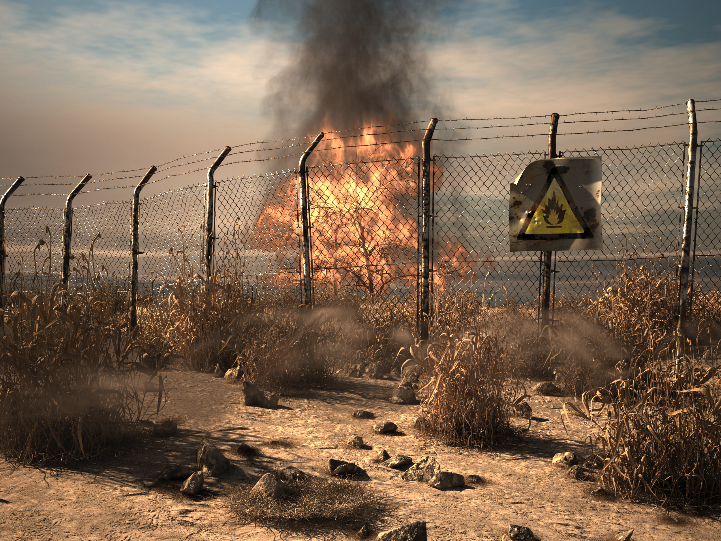 Pues me gusta más ese primer render porque el tono general de la imagen es más anaranjado, acorde con el fuego que se está produciendo. Da más sensación de estar metido dentro de la escena, con ese clima de incendio.