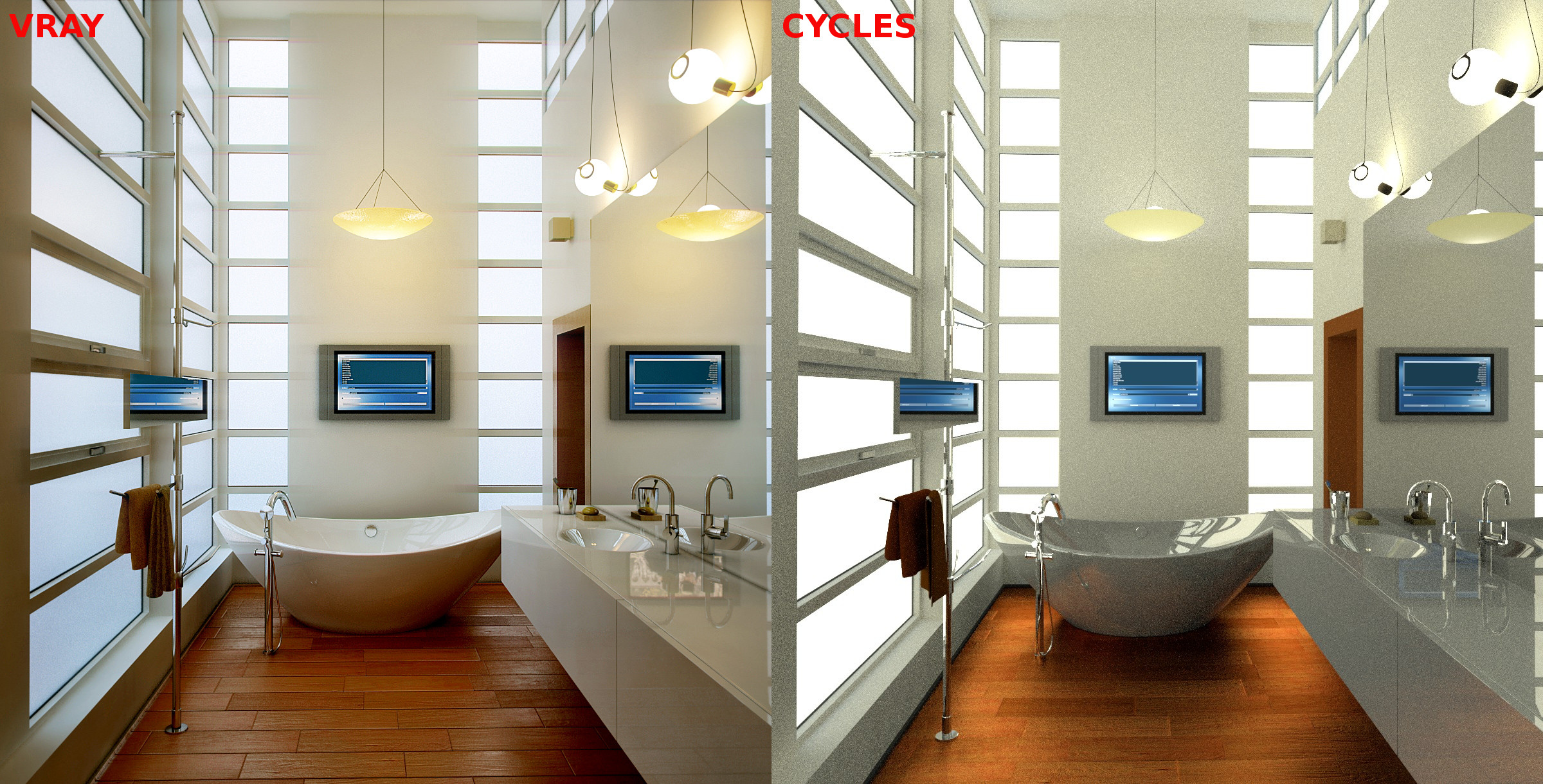 Edito: Perdón la confusión, si bien efectivamente existe Vray para Blender, esta comparación es 3dsmax+Vray versus Blender+Cycles